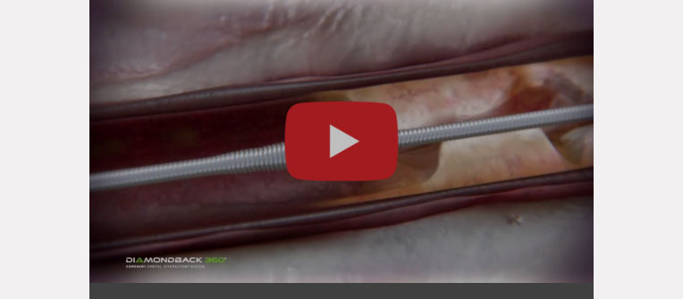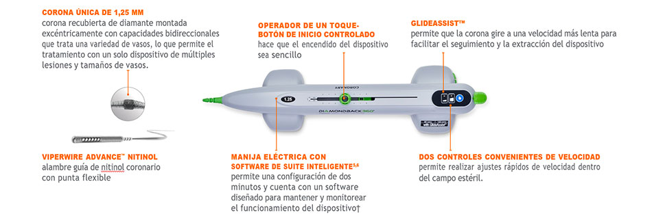 Diamondback 360™ es el único sistema de aterectomía con una corona recubierta de diamante que orbita a 360 grados, específicamente diseñado para atacar el calcio severo para resistir la formación de aneurismascolocación, expansión y aposición óptima del stent.1, 2-4