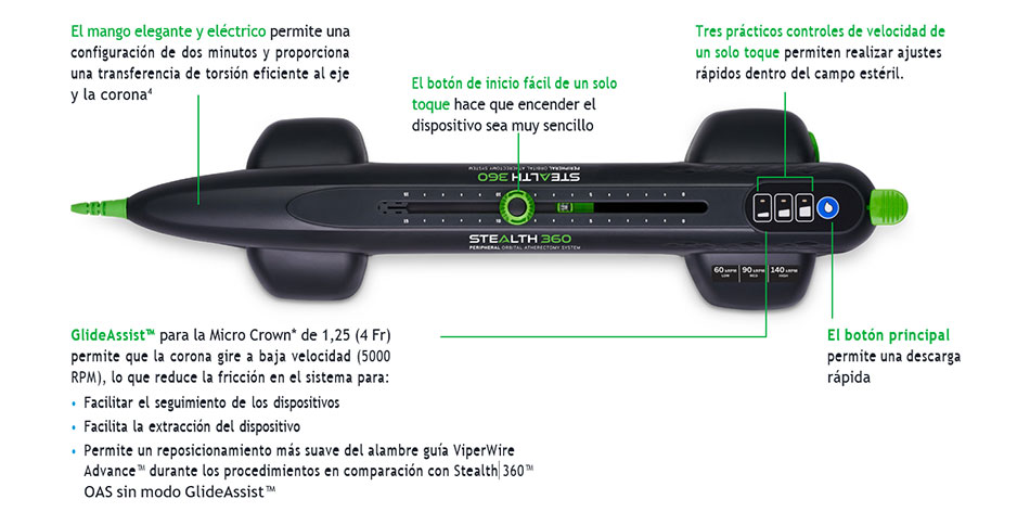 El sistema de aterectomía orbital Stealth 360 TM (OAS) está diseñado específicamente para tratar la placa calcificada de leve a severa en las arterias periféricas con una corona recubierta de diamante.1 La corona gira 360 grados contra la pared del vaso para pasar de calcificada a dócil, de manera segura y eficiente.2,3