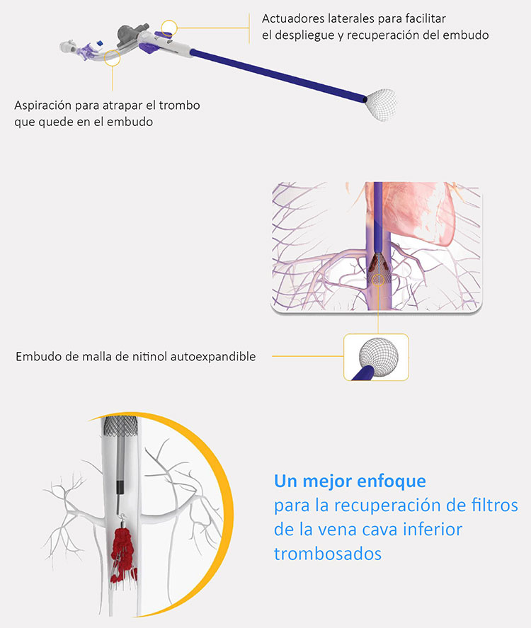 - Trap Emboli: Embudo de malla de nitinol autoexpandible de 33,5 mm que permite una aposición completa de la pared de la VCI.